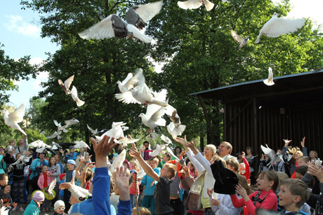 BALANDŽIAI: Dešimties metų vaikai – parko bendraamžiai – buvo pakviesti į dangų paleisti apie 150 balandžių.