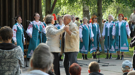 DAINOS: Baltarusių dainų ansamblis „Kupalinka“ savo dainomis išjudino senjorus šokti.