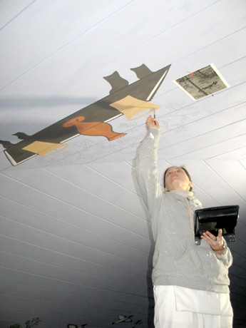 Restauratorių darbas varginantis: tapyti reikia iškeltomis rankomis.