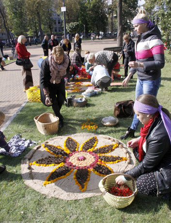PLENERAS: Vakar 34 Šiaulių miesto švietimo ir ugdymo įstaigos skvere prie Šiaulių miesto savivaldybės iš gamtinių medžiagų kūrė spalvingas mozaikas.