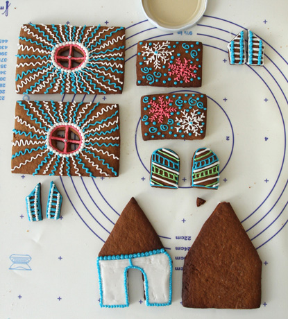 PUOŠIMAS: Namelis pagaminamas iš atskirų imbierinių meduolių dalių – prieš tai jis papuošiamas įvairiaspalvių raštų glajais, cukrine ar marcipanine mase.