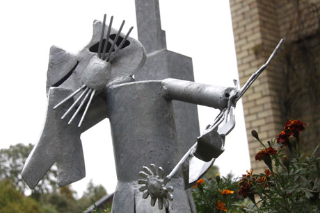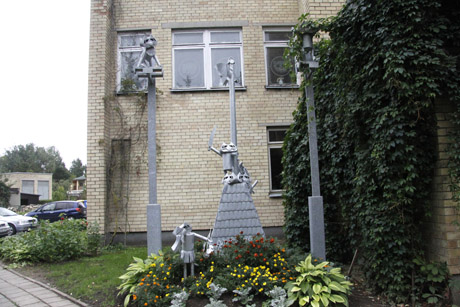 Gėlių klomboje įbetonuoti stulpai su katinų karžygių figūrėlėmis, jų papėdėje – „Katinų motina“ braukia nosine ašarą: „aprauda kritusius“.