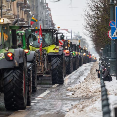 Antradienio rytą Vilniaus Gedimino prospekte rikiuojasi pirmosios protestuojančių ūkininkų sunkiosios technikos kolonos. Protestuojama prieš ūkininkų požiūriu nesprendžiamas ilgametes sektoriaus problemas.