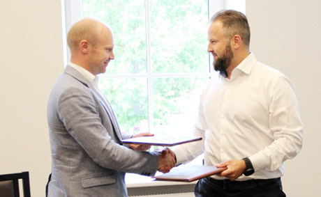 SUTARTIS: Šiaulių sporto gimnazijos salės statybos rangų sutartį pasirašė Administracijos direktoriaus pavaduotojas Martynas Šiurkus (kairėje) ir konkursą laimėjusios bendrovės „Infes“ direktorius Arvydas Markevičius.