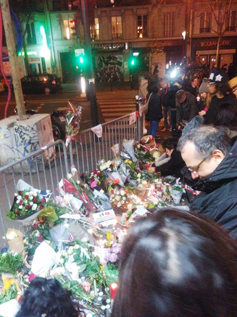 Prancūzas sako, kad ir šeštadienio vakarą Paryžiaus gatvėse vyravo įtempta atmosfera. Dėl masinių susibūrimų draudimo čia nebuvo daug žmonių. Paryžiaus koncertų salė „Bataclan“ buvo beveik neprieinama. Šalia jos minia gyventojų degė žvakes, nešė gėles, stovėjo, meldėsi, raudojo.