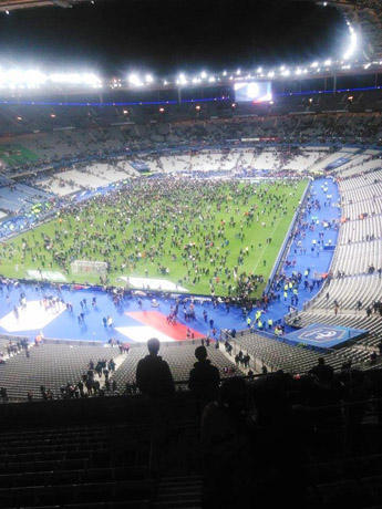 Sunerimti privertė telefonu gautas pranešimas apie susišaudymą Paryžiaus centre. Dalis žiūrovų iš savo vietų pakilo likus dešimčiai minučių iki mačo pabaigos. Bet panikos nekilo.