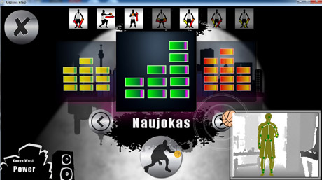 ŽAIDIMAS: Interaktyvaus žaidimo „Krepšinis kitaip“ lange dešinėje pusėje rodomas žmogus, kurį užfiksuoja judesių atpažinimo įrenginys. Pasirinkus krepšininko tipą, reikia atlikti nurodytus krepšinio judesius.