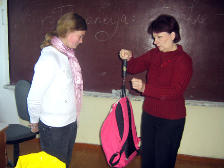 AKCIJA: Akcijos Šiauliuose metu šiemet pasverta 1820 penktokų ir aštuntokų kuprinių. Nuotraukoje – V. Kudirkos progimnazijoje moksleivių kuprines sveria visuomenės sveikatos priežiūros specialistė Irena Kvedarienė (dešinėje).