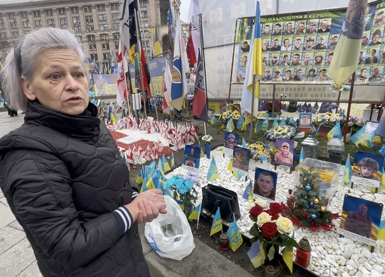 „Jūs Lietuvoje eglutes puošiat namuose ir miestų aikštėse, o mes dabar ir žuvusiems kariams. Šį angeliuką užkabinsiu ant viršaus, nes sūnus Olegas ir žuvę brigados bendražygiai yra virtę angelais. Olegas su tėvu kovoti išėjo pirmomis dienomis, vėliau prisijungė ir antras sūnus, sutuoktinį demobilizavo, suėjus 60-iai metų. Olegas žuvo prie Bachmuto. Pražilau iš skausmo, veržiausi į frontą, norėjau keršyti, bet nepaėmė. Kilo minčių žudytis, bet susiėmiau, ėmiau puošti brigados atminimo vietą, rinkti paramą frontui. Smerkiu tuos, kurie slapstosi nuo armijos”, – pasakojo moteris.