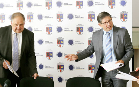 VA­DO­VAI: ŠU rek­to­rius Do­na­tas Jur­gai­tis (kai­rė­je) ir ta­ry­bos pir­mi­nin­kas Rim­vy­das Vaš­ta­kas į spau­dos kon­fe­ren­ci­ją atė­jo su ži­nia – uni­ver­si­te­tas ak­re­di­tuo­tas 6 me­tams.