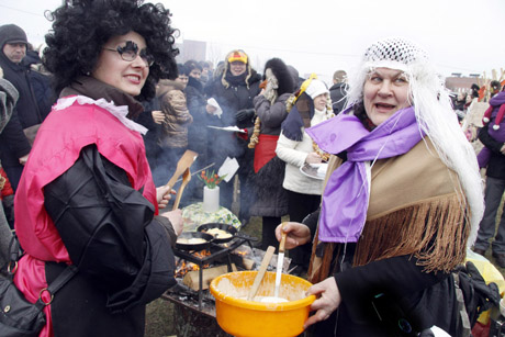 „Žiema žiema, bėk iš kiema“, – skandavo linksmuoliai šiauliečiai šeštadienį prie senojo Žaliūkių malūno susirinkę švęsti Užgavėnių. Šimtai žmonių ragavo blynų, žaidė žaidimus, klausėsi persirengėlių pokštų. Minioje sukiojosi ir keletas pretendentų į Šiaulių mero postą.