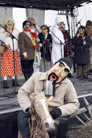 LINKSMYBĖS: Nuo scenos vestuvininkai kartu su muzikantais į Užgavėnes susirinkusius žmones kvietė „švęsti veselę, dešrą valgyti ir arielką gerti“.