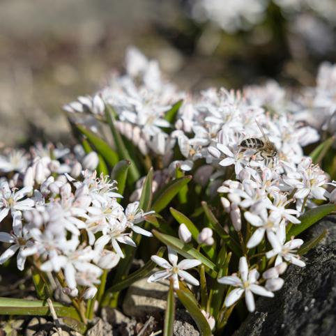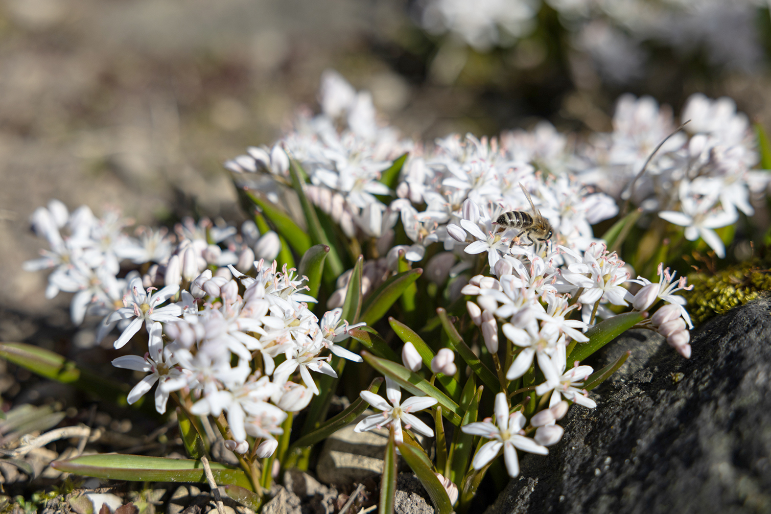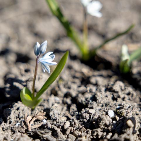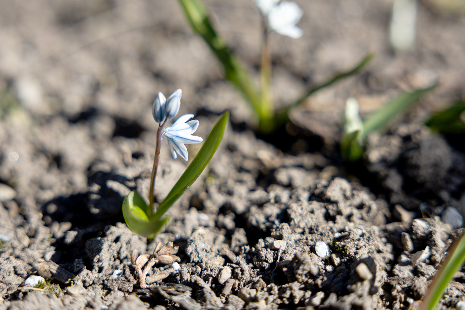 Žydi ir scylės, ir mažiau girdėta scyliažiedė puškinija – žiedas žydras su baltu dryželiu. Ši gėlė Botanikos sode pasodinta tik pernai.