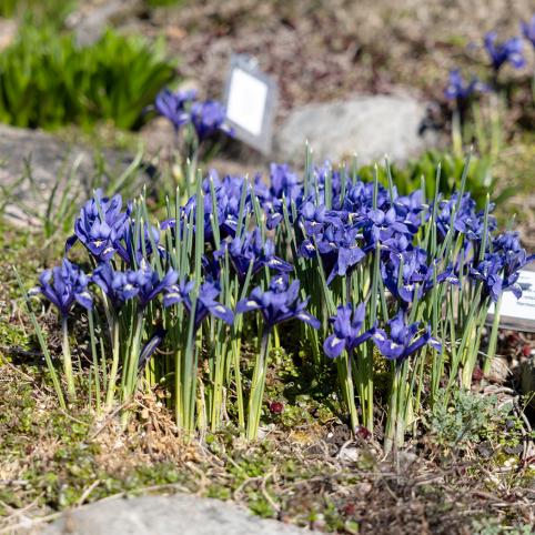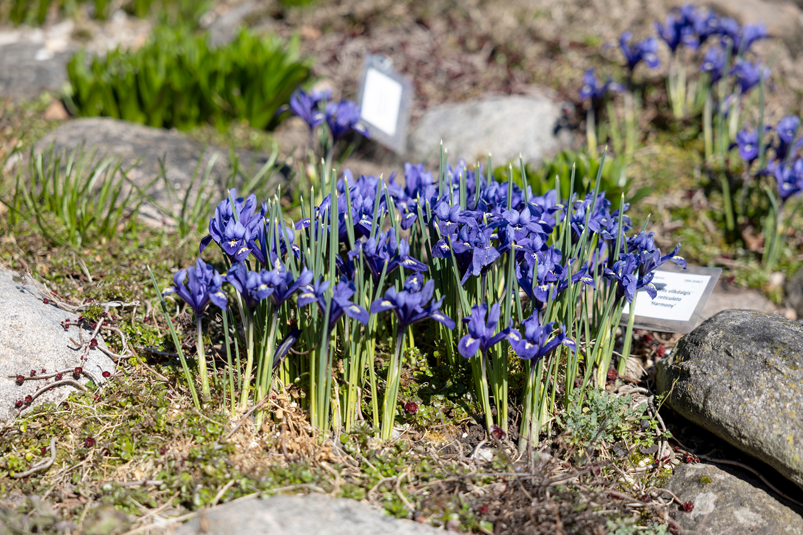 Gausiausias žiedų šiuo metu – kalnų skyrius. Jo puošmena – draugėn susibėgę melsvi ir violetiniai tinkliniai irisai, auginami iš svogūnėlių.