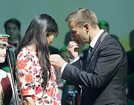 APDOVANOJIMAS: Maratonininkei Rasai Drazdauskaitei segdamas padėkos ženklą meras Artūras Visockas jį paseilėjo.