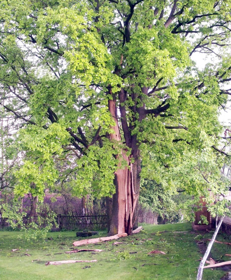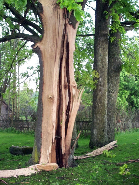 ĄŽUOLAS: Kleboniškių kaime trenkęs žaibas suniokojo gyvenamos sodybos kieme augusį šimtametį ąžuolą.