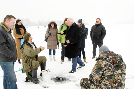 Europos parlamento narys, buvęs aplinkos ministras Valentinas Mazuronis šeštadienį aplankė žvejus ant Talkšos ežero ledo, padovanojo smaigų ir priminė, kad reikia rūpintis savo saugumu.