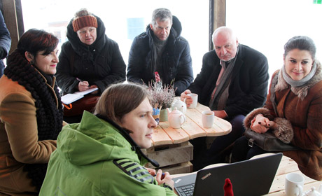 Po susitikimo su žvejais kavinėje „FoxSpot“ pokalbiui prie arbatos puodelio apie Talkšos ežero pakrantės pritaikymą poilsiui ir sportui susėdo (iš kairės) sportinės žūklės atstovas Mindaugas Alekna, „Laisvųjų piliečių“ narė Giedrė Brazlauskaitė, architektė Rasa Budrytė, Šiaulių prekybos, pramonės ir amatų rūmų prezidentas Vidmantas Japertas, Europos parlamentaras Valentinas Mazuronis, Savivaldybės administracijos laikinoji direktorė Giedrė Mendoza Herrera.