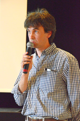 Vykintas Vaitkevičius su archeologinių tyrinėjimų rezultatais supažindina Naisių bendruomenę.