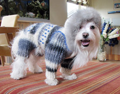 PUOŠMENA: Nikiui šeimininkės megztas kombinezonas su gaubtuvu — karoliukais ir audinės kailiu padailinta puošmena ir šilta vilnonė apsauga nuo šalčio.