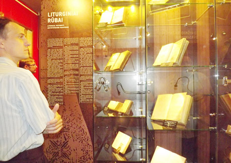 Skaralinėje ekspozicijoje lentynose po stiklu rikiuojasi giesmynai ir maldaknygės, iš kurių seniausia išleista 1737 metais.