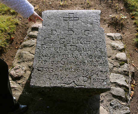Muziejaus kiemelyje saugoma pirmoji S. Daukanto kapo antkapinė plokštė. Spalio dangus – įnoringas, pilkų debesų prieblanda dengia antkapio įrašą, jį pavyksta įskaityti tik nušvietus spinduliams: „D. D. G. Cze Gul Kunas Symona Daukąta Rasztinika Warga Pieles Gimuse Metuse 1793 Miruse 1864 M. Sijkie 6 Dienoi“.