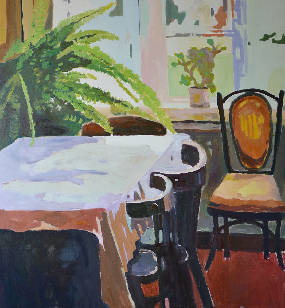 Priešingai jo paveiksluose kambarių interjerai. Čia viskas turi būti gražu. Daiktai – stalas, kėdės, aukšta atkalte sofa, pianinas, dargi gėlių vaza irgi ne pirmos jaunystės, tačiau nublizginti, anei vienos dulkelės. Kambarys, kuriame norisi būti.