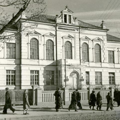 Vilniaus gatvėje dar nebuvo įrengta pėsčiųjų bulvaro. Šia gatve važiavo automobiliai, autobusai, arkliais kinkyti vežimai, šaligatviais vaikščiojo pėstieji. Nebuvo ir mokyklos priestato, jo vietoje buvo stadionas. Šalia jo buvo mokyklos daržas, sodininkystės bandymų sklypas. Mokyklos teritorija nuo Kaštonų alėjos buvo atskirta iki šiol išlikusia akmenine siena, iš kitos pusės, nuo Vilniaus gatvės, aptverta betonine tvora. Būdami mokyklos mokiniai mes šią paslaptingą Didždvario sieną įsivaizdavome, kaip neįveikiamą tvirtovę, pilį. Mėgdavome ant jos laipioti, bandydavome visą viršumi pereiti ir taip patirti pirmus drąsos ir išmėginimo pojūčius.