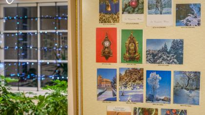 Sveikinimus ir linkėjimus siunčia Burbiškio dvare eksponuojami atvirukai