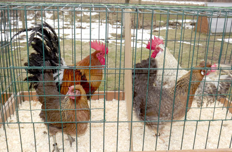 Gediminas Jančauskas kieme išrikiuoja keturis narvus su veislinėmis porelėmis. Pirmajame kudakuoja ir kakariekuoja australorpai.