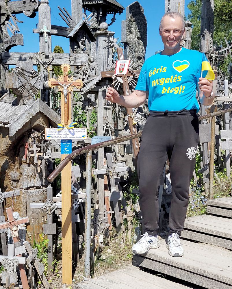 „Kryžių kalne žvakių degti negalima, tad keletui minučių stabtelėjau Joniškio kapinėse ir uždegiau žvakę ant Lietuvos partizanų kapų, juos pagerbdamas. Pakeliui į Kryžių kalną taip pat aplankiau Holokausto aukų kapą Vilkiaušio miške. Ten irgi uždegiau žvakę, apjuosęs ją Ukrainos ir Lietuvos vėliavų spalvų juostele. Bet čia dar tik žygio pradžia, dar laukė ilgas kelias, – pasakoja V. Valiukas. – Galvojau užtrukti penkias valandas, o prabėgo visos aštuonios, kol, įveikęs 33 kilometrus ir 680 metrų, tikslą pasiekiau. Nueitą kelią pavadinau Taikos žygiu. Šiuo sudėtingu, įtemptu metu norisi visiems palinkėti taikos, optimizmo, pozityvumo, sveikatos ir ištvermės. Ir tikiu, kaip užrašyta ant mano žygio marškinėlių: „Gėris nugalės blogį!“