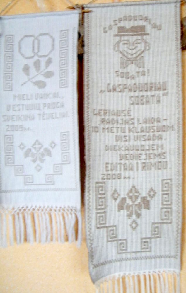 Būtent austi žodžius, prasmingas frazes, palinkėjimus patiko ir Marytei. Tik tokių didelių tekstų austi ji nesiimtų. Nenori ilgai laukti rezultato. Imasi tokių darbų, prie kurių nereikėtų sėdėti mėnesių mėnesius.