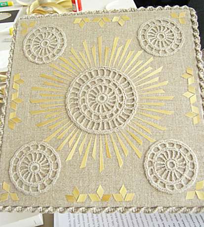 Ant lino medžiagos ovalo, sukarpę šiaudų juosteles kvadratėliais, rombais, trikampėliais, užsiėmimų dalyviai klijavo saulutes, gėlių žiedus, medelius, bandė išvingiuoti žalčiukus.