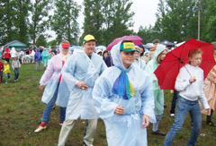 Čia išaiškėja festivalio šeimininkų privalumai — estai į kelią, kuriame rikiuojasi šokėjai, atvažiavę nuosavais automobiliais, tad jiems iki savosios vietos nereikia klampoti per lietaus plakamą žvyrkelį.