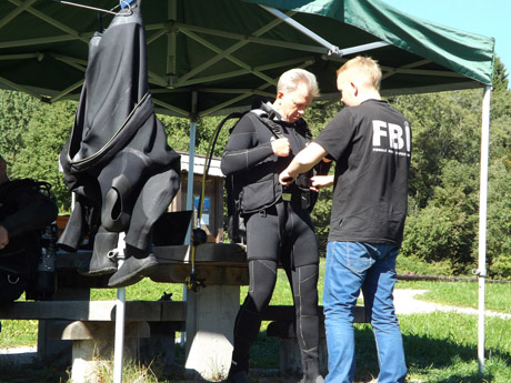Ant Platelių ežero pakrantės stovinčioje pavėsinėje kabo narų kostiumai, sudėta nardymo įranga. Instruktorius Egidijus Ežerinskis ant stalo kloja sutarties lapus. Reikia sąžiningai, kaip per išpažintį, atsakyti į keliolika klausimų apie sveikatą. Šešiese palinkstame prie popieriaus lapų.