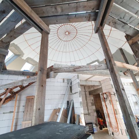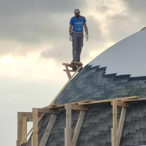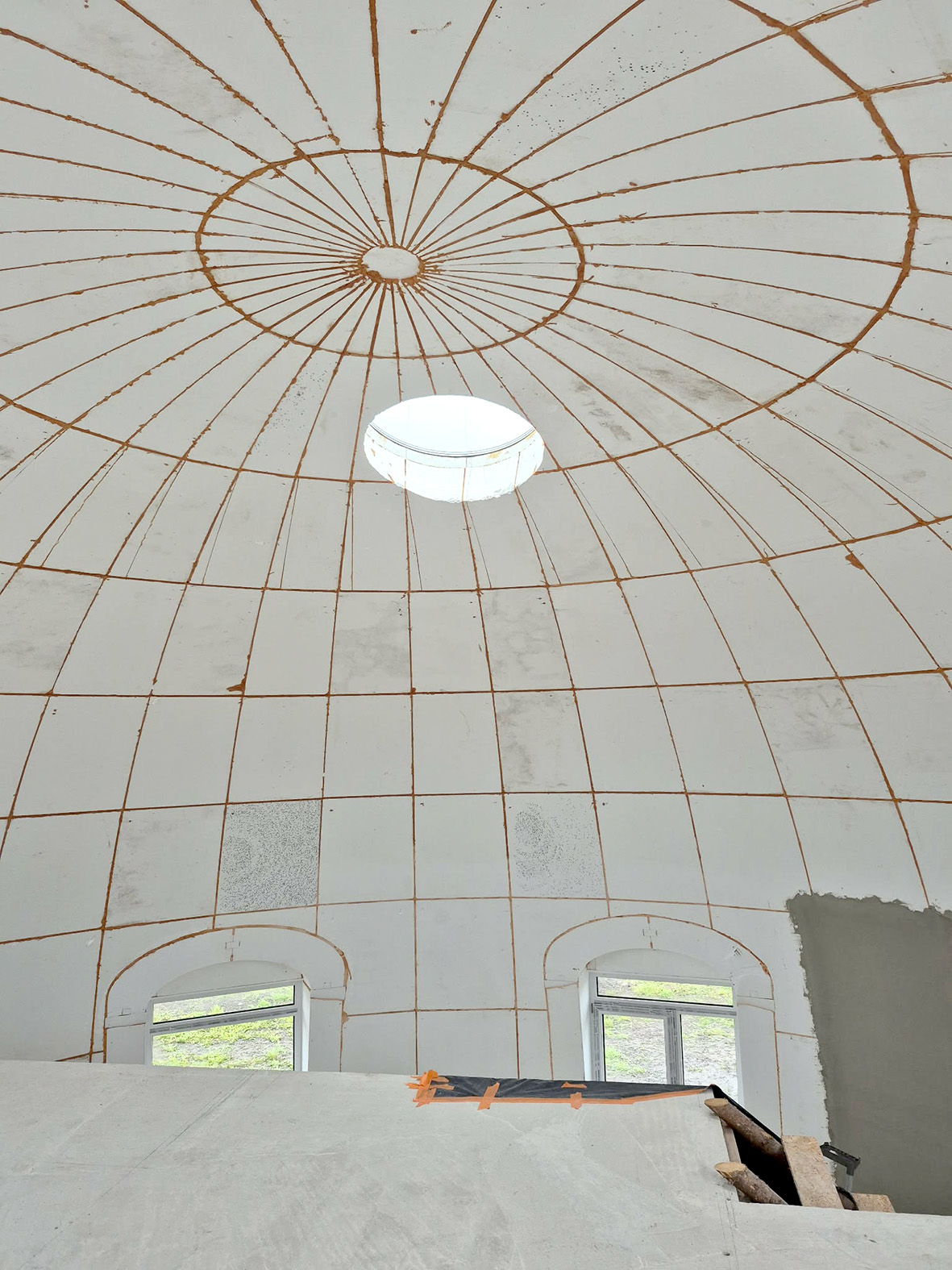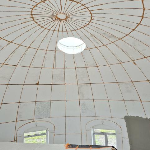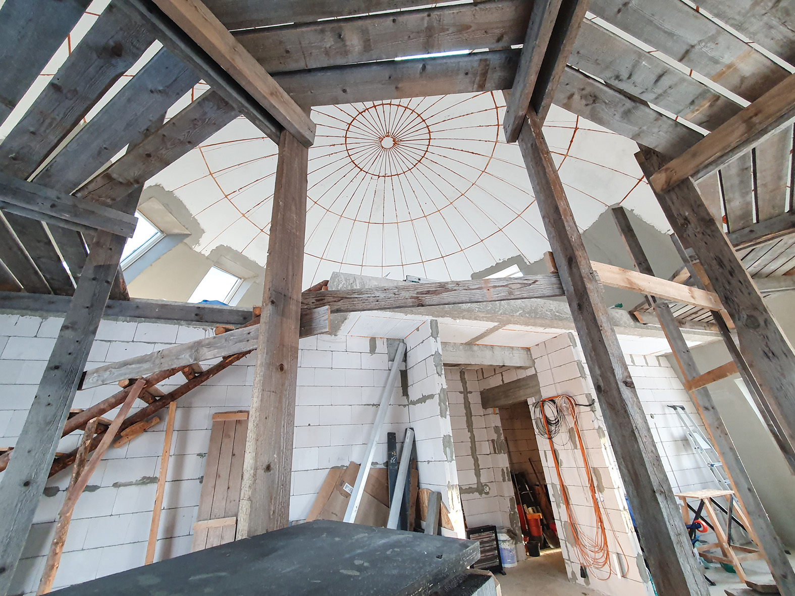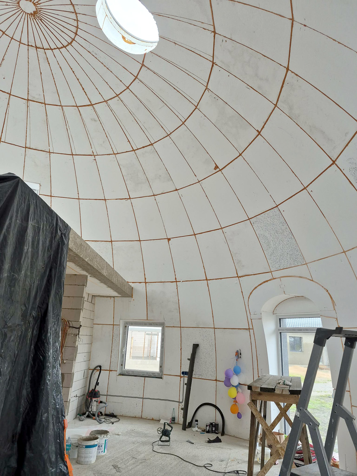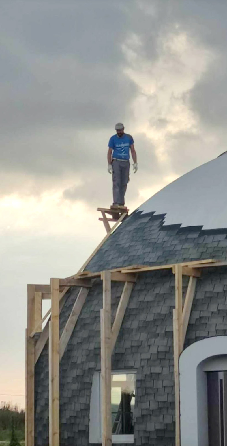 Net ir pastolius Žilvinas susikūrė pats – kupoliniam statiniui tinkančių pastolių gauti nėra paprasta, o siūlomų modulinių kaina – ohoho! Tad, paties žodžiais, susikalė savotišką Trojos arklį su ratukais, kad dirbdamas galėtų aukštai pakilti ir aplinkui namą važinėti – darbas vyko kur kas greičiau, negu būtų reikėję vis perkelti kopėčias.