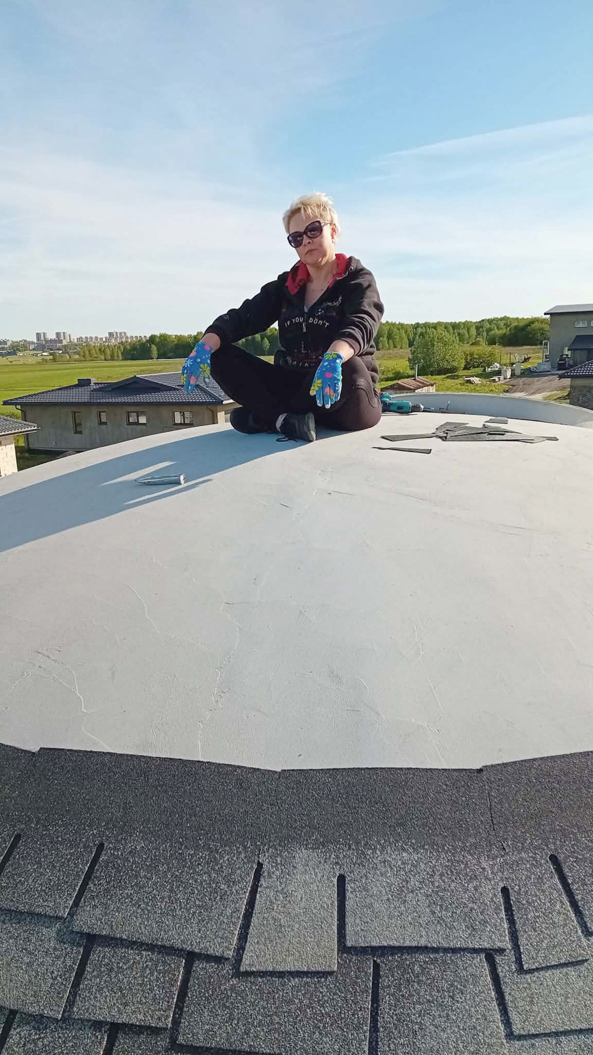 Dabar smagu prisiminti, kaip abudu atliko savo „kupoliuko“ išorinę apdailą, kantriai reikiamais gabaliukais pjaustydami ir tvirtindami dangos žvynelius, bitumines čerpeles, – kuo aukščiau, tuo gabaliukai mažesni, mažesni. Šito darbo specifika, pasak Ž. Gedmino, nė iš tolo nepanaši į tą, kuri naudojama klojant tokias čerpeles ant standartinio namo stogo.