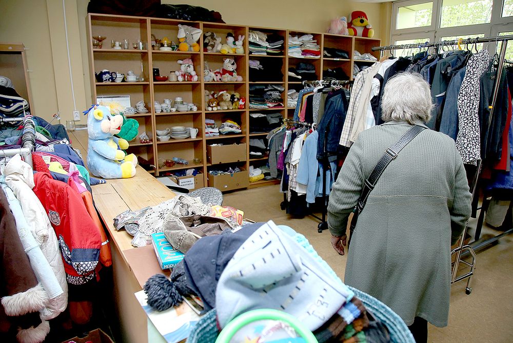 Už ki­tų du­rų – dė­vė­tų dra­bu­žių ir nau­do­tų daik­tų pa­tal­pos. "Gau­na­me dau­giau, ne­gu pa­nau­do­ja­me", – sa­ko R. Za­bie­lie­nė. Čia pa­si­rink­ti dra­bu­žių atei­na ne­pa­si­tu­rin­čios šei­mos, ne­bran­giai jų ga­li įsi­gy­ti ir ki­ti šiau­lie­čiai, taip fi­nan­siš­kai pa­rem­da­mi šei­mos na­mus. Krau­tu­vė­lė­je dir­ba sa­va­no­rės.