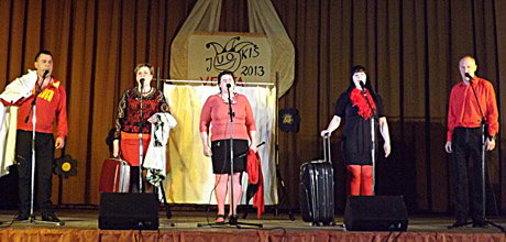 GRUPĖ: Ventos kultūros namų humoro grupė „Smaguriai“ debiutavo humoro šventės „Juokis 2013“ didžiojoje scenoje Šakiuose.