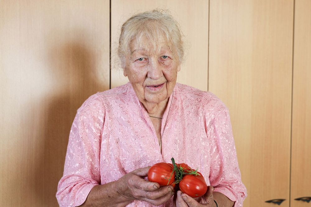 Ji pasakojo, kad ant pomidoro stiebo buvo užaugęs tik šis vienintelis vaisius. Senjorė neprisiminė pomidoro veislės, bet sakė, kad vaisių ant stiebų yra nedaug, tačiau jie labai skanūs. Ir dičkis greičiausiai taps pietų užkandžiu.