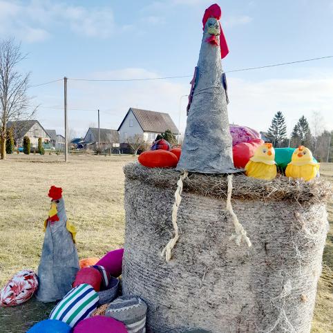 O štai nuo Žeimelio pusės į riedančius keliu iš tolo didelėmis ilgomis blakstienomis puoštomis išplėstomis akimis žvelgia iš trijų rulonų sudėtas gigantiškas viščiukas, prie kurio aplink žaluma tiesiog švyti žolė. Atidžiau pasidairius matyti, kad kitur žolė dar rusva, iš po žiemos neatsigavusi. Tad iš kur toje vietoje tokia pavasarinė gaiva? Ogi, pasirodo, toji žolė specialiai dažyta. Šia dekoracija rūpinosi Trečiojo amžiaus universitetas ir Vaikų dienos centras „Erdvė“, kurių pastangomis taip pat įrengtas dar vienas patrauklus kampelis Stepono Dariaus ir Stasio Girėno bei Naujosios gatvių sankryžoje, kur kiekvienas norintis atrakcijos gali nusifotografuoti, stabtelėjęs už marginto didelio kiaušinio ir iškišęs galvą pro specialiai tam paliktą angą.