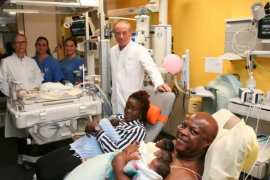 Šiaulių rajono meras A. Bezaras perdavė raktelius nuo naujo automobilio Kuršėnų vaikų globos direktoriui F. Rudzinskui (kairėje).