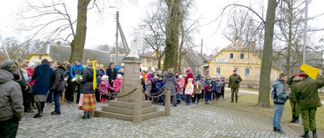 VĖLIAVA: Rozalimo mokyklos moksleiviai ir mokytojai šv. mišiose už Lietuvos Nepriklausomybę pašventintą trispalvę, aidint savanorių salvėms, iškėlė miestelio skvere prie Angelo.