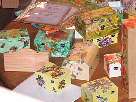 DOVANOS: Savo draugams Minupių bendruomenė įteikė pirmininkės dekupažo technika išgražintų dėžučių, paveikslų.