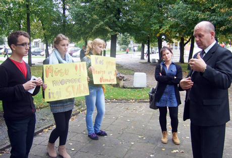 PIKETAS: Su piketuotojais išėjęs pakalbėti vicemeras Kazimieras Augulis (dešinėje) pritarė mokinių mintims ir protestui.