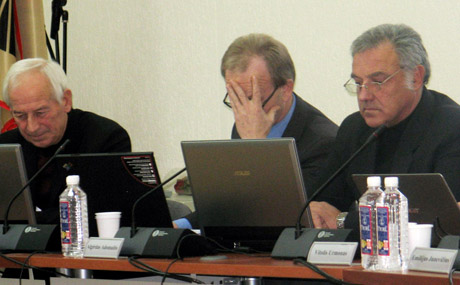 ETIKA: Etikos komisijos pirmininkas Justinas Macijauskas (viduryje) apie nepadorius gestus sakė nieko nežinantis.