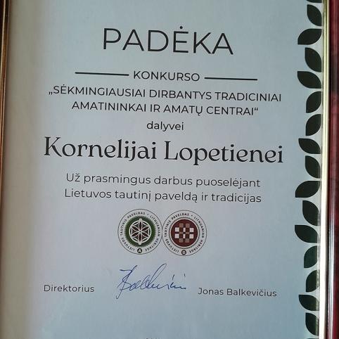 „Gruodžio mėnesį sulaukiau Žemės ūkio agentūros prie Lietuvos žemės ūkio ministerijos kvietimo atvykti į Metinę tautinio paveldo konferenciją. Ji buvo rengiama Kėdainių rajone, Krakių kultūros centre, – pasakoja Kornelija Lopetienė. – Kvietimas viliojo įspūdinga pramogine programa. Žinojau, kad per konferencijas paprastai apdovanojami aktyviausi tautinio paveldo puoselėtojai. Tačiau kažkodėl nesureikšminau kvietimo.“