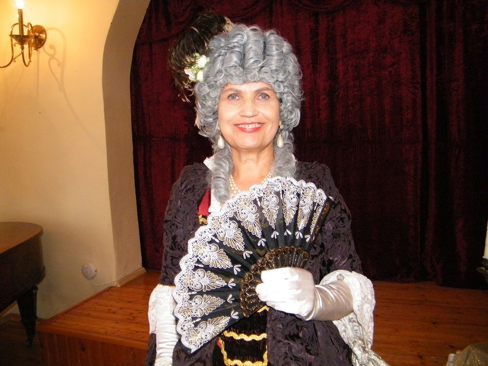 Šeimininkė vilki kūno linijas išryškinančią ir pabrėžiančią dvigubą suknelę. Vietoj šukuosenos garbanotų plaukų perukas, baltos pirštinės, rankinukas, vėduoklė.