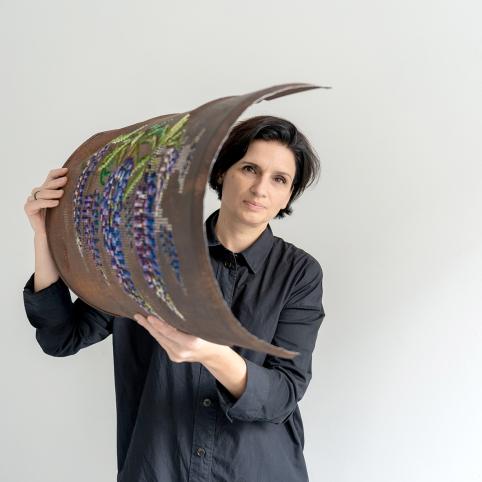 Pasitelkdama specifinę siuvinėjimo kryželiu ant kietų metalo paviršių techniką, menininkė pramoninius ar kasdieniškus objektus transformuoja į jautrius ir daugiaprasmius meno kūrinius.
