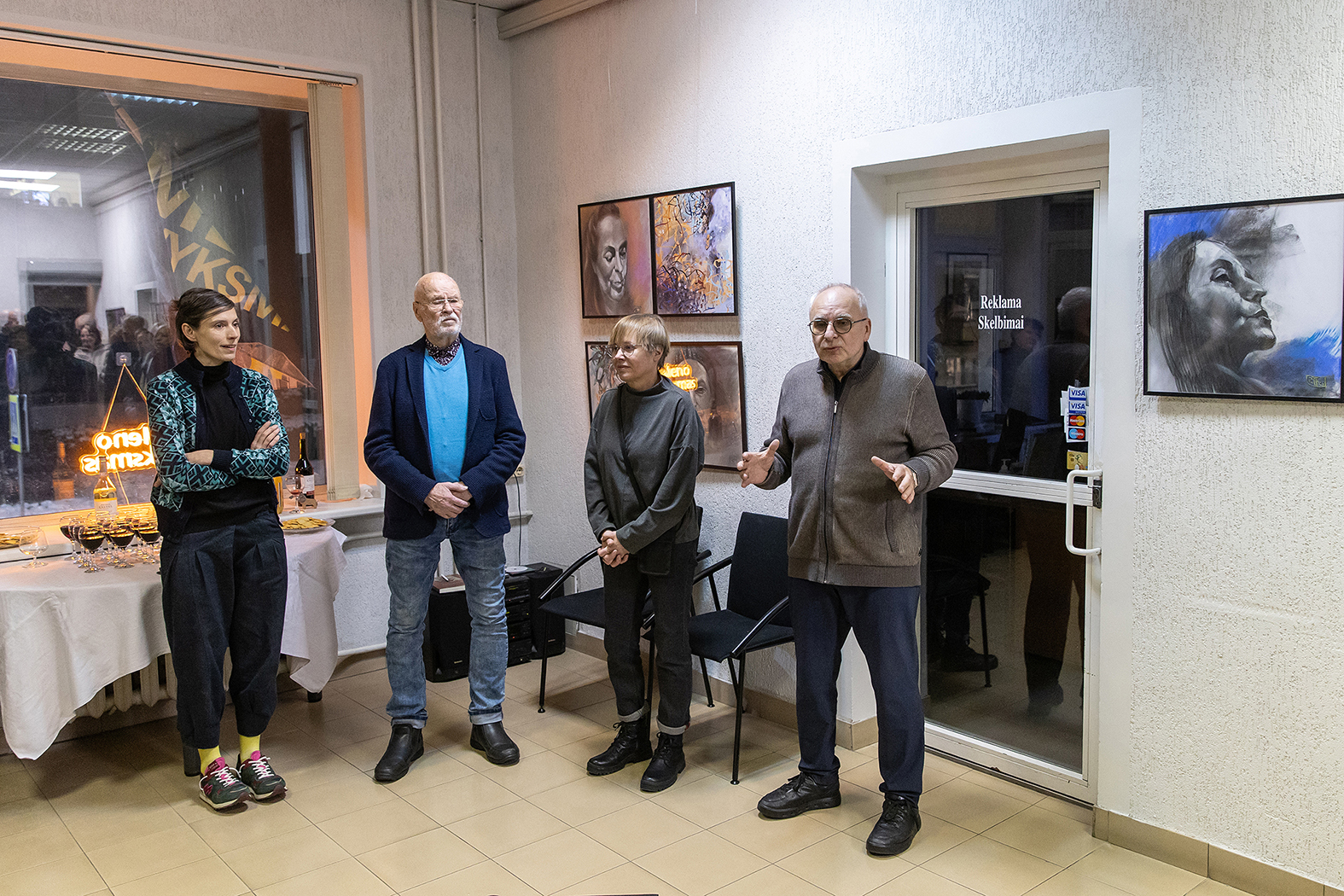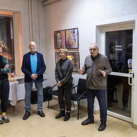„Meno vyksmo“ dalyvius sveikina (iš dešinės) laikraščio „Šiaulių kraštas“ vyriausiasis redaktorius Vladas Vertelis. Šalia – dailininkai Nijolė Sitonytė, Rimantas Tomas Buivydas, Vaiva Kovieraitė-Trumpė.
